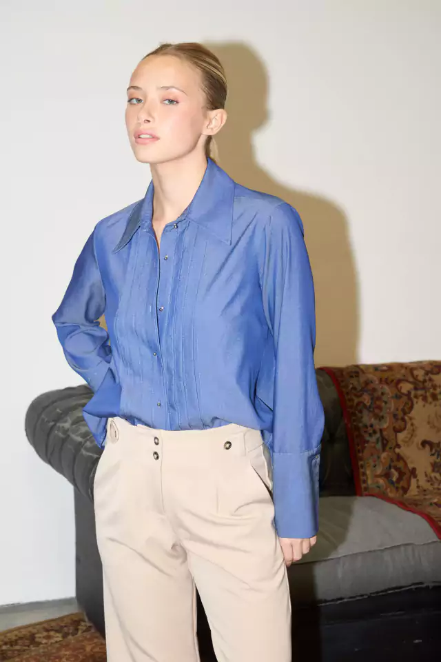 Pantalón estilo sastrero. Con detalle de trabas en la cintura. Posee vista interna en la cintura y bolsillos ojal en la espalda.
