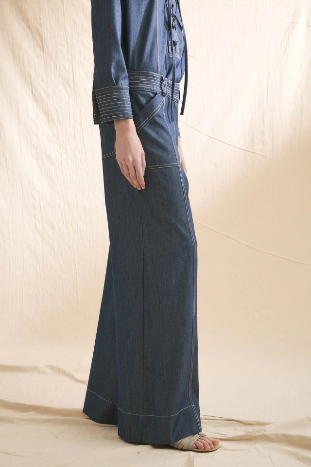 Un pantalón tiro alto con estilo oxford que combina elegancia y comodidad. Está confeccionado con una tela super liviana, ideal para lucir sofisticada sin perder frescura. Destacan sus costuras a contratono, que aportan un detalle sutil y moderno. Perfecto para armar looks formales o casuales con un toque distintivo.