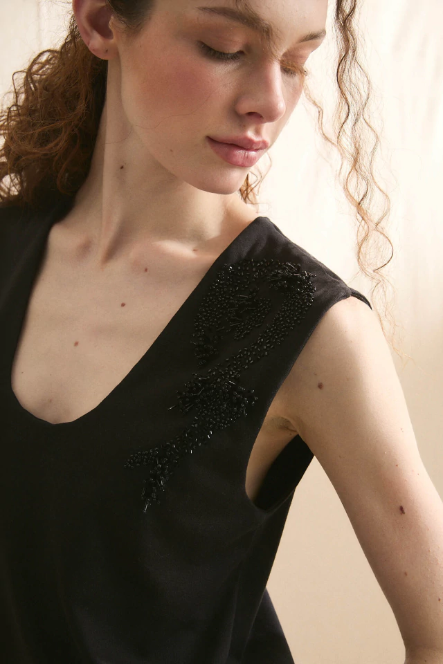 Musculosa de lycra con un escote pronunciado que realza la figura con delicadeza. Presenta un aplique bordado lateral adornado con canutillos que aporta un toque de distinción y sofisticación. Su corte anatómico se adapta perfectamente al cuerpo, combinando comodidad y elegancia en una sola prenda ideal para ocasiones especiales o para realzar tu estilo cotidiano.