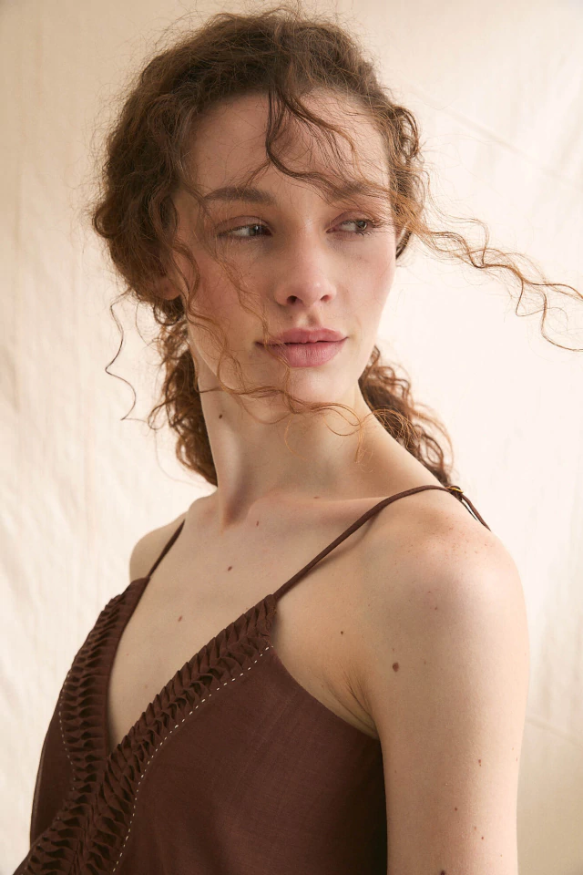 Confeccionado en algodón con leve transparencia, de caída natural. El frente incorpora alforzas, que enmarcan el escote y aportan un detalle artesanal y distintivo. La espalda tiene smock elástico, lo que permite un calce cómodo y adaptable al cuerpo.
